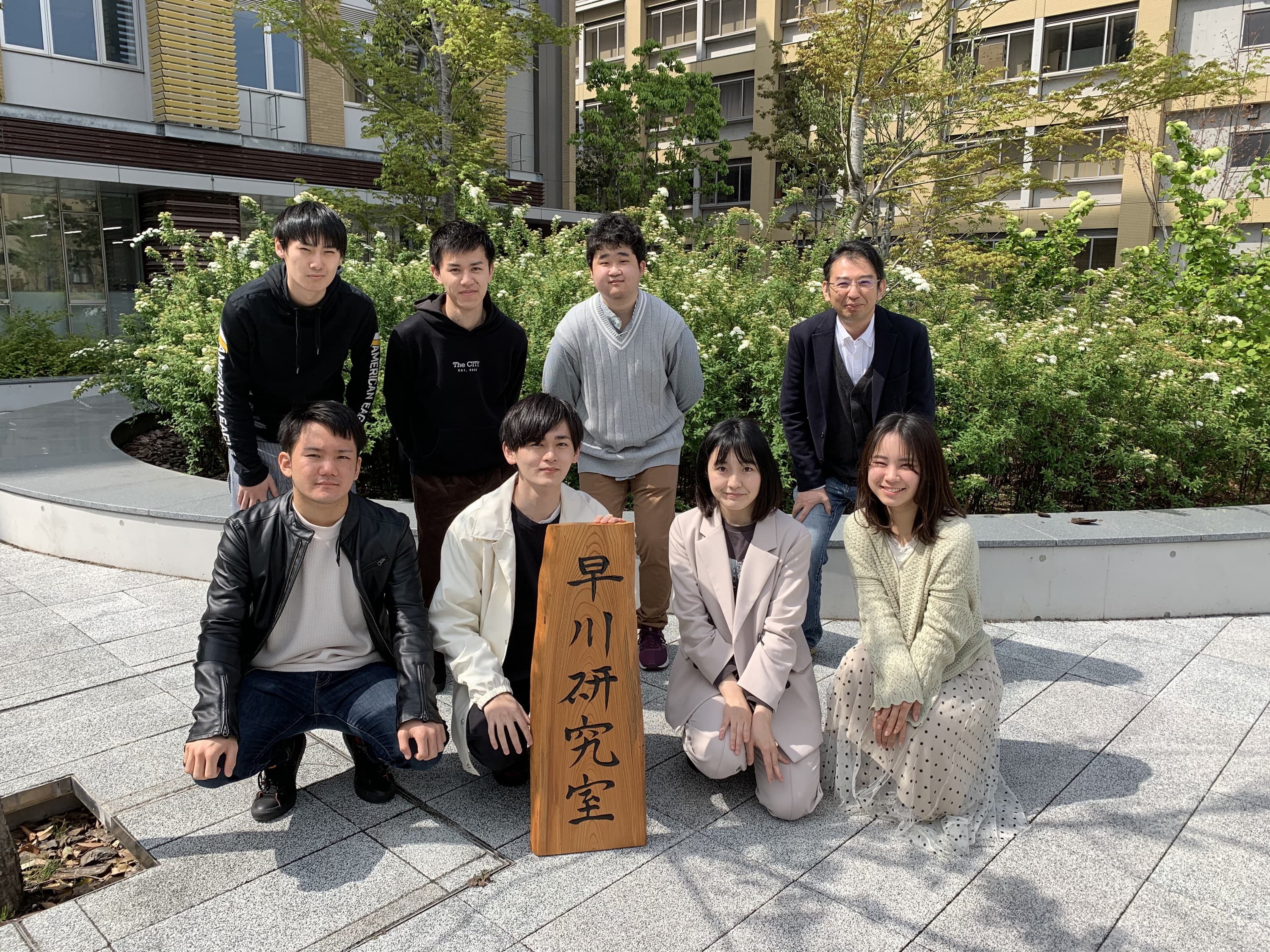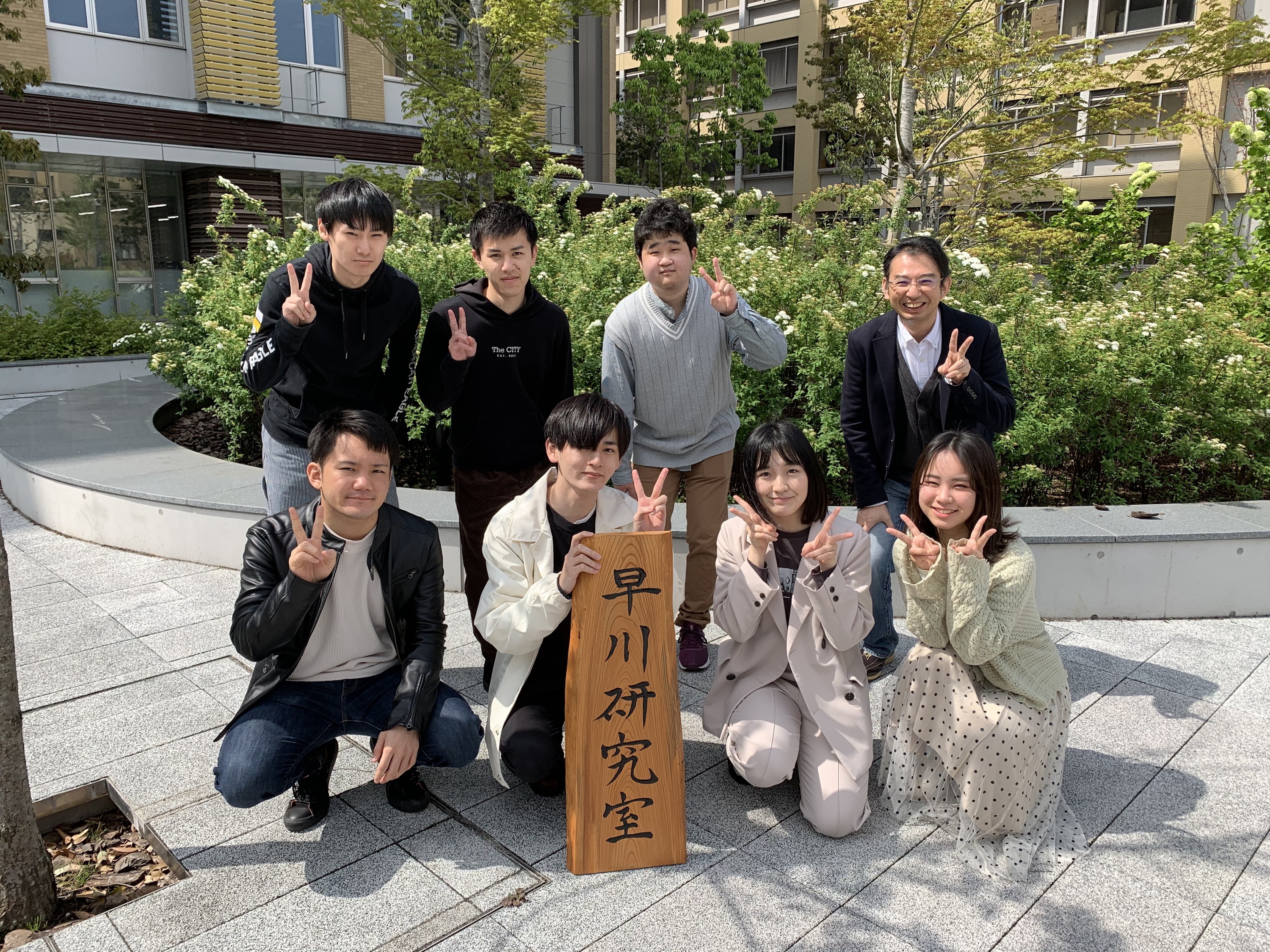 天気がよかったので早川研第1期生と記念写真をとりました(撮影のときのみマスクを外しました).明るい学生さんと,どんな面白い研究成果が出せるか楽しみです.看板は,書道が趣味の早川の父に書いて貰いました.