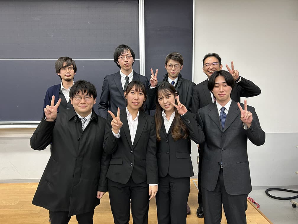 発表後に理工学部前で記念撮影(撮影は会場バイトだった志鎌君).あれ?木村君どこいった?