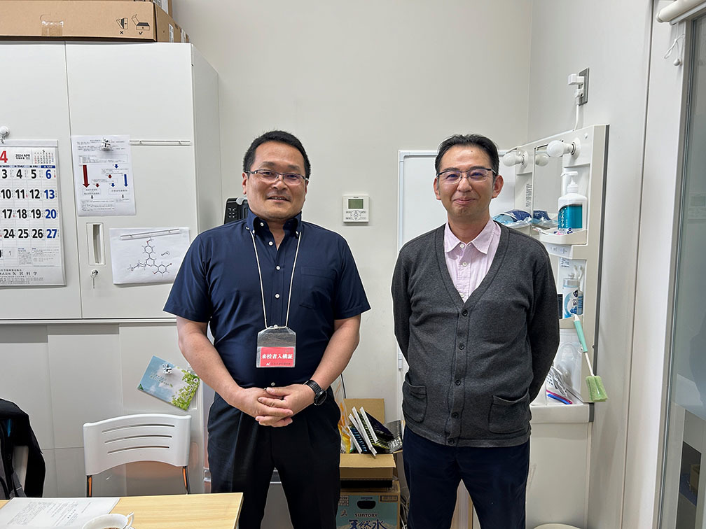 共同研究を展開している名古屋大学ITbMの佐藤綾人先生が研究室にお越しくださいました.佐藤先生と早川は名古屋大学 上村研の同期です(なので佐藤”先生”と呼んだことは一度もありません(笑)).よく深夜まで一緒に実験したり,朝まで飲みながら,うまくいかない実験の打開策をディスカッションしたのが懐かしい思い出です.有機合成からバイオロジーまで守備範囲が広く,また人間的にもとても面白い人です.今回来訪していただき,現在展開中の共同研究について,chemistry側から提案できることを相談しました.『友がいてこそ,研究は楽しい』と早川は思います.学生さんも学会等で同じ志の友達を全国に作ってください.
