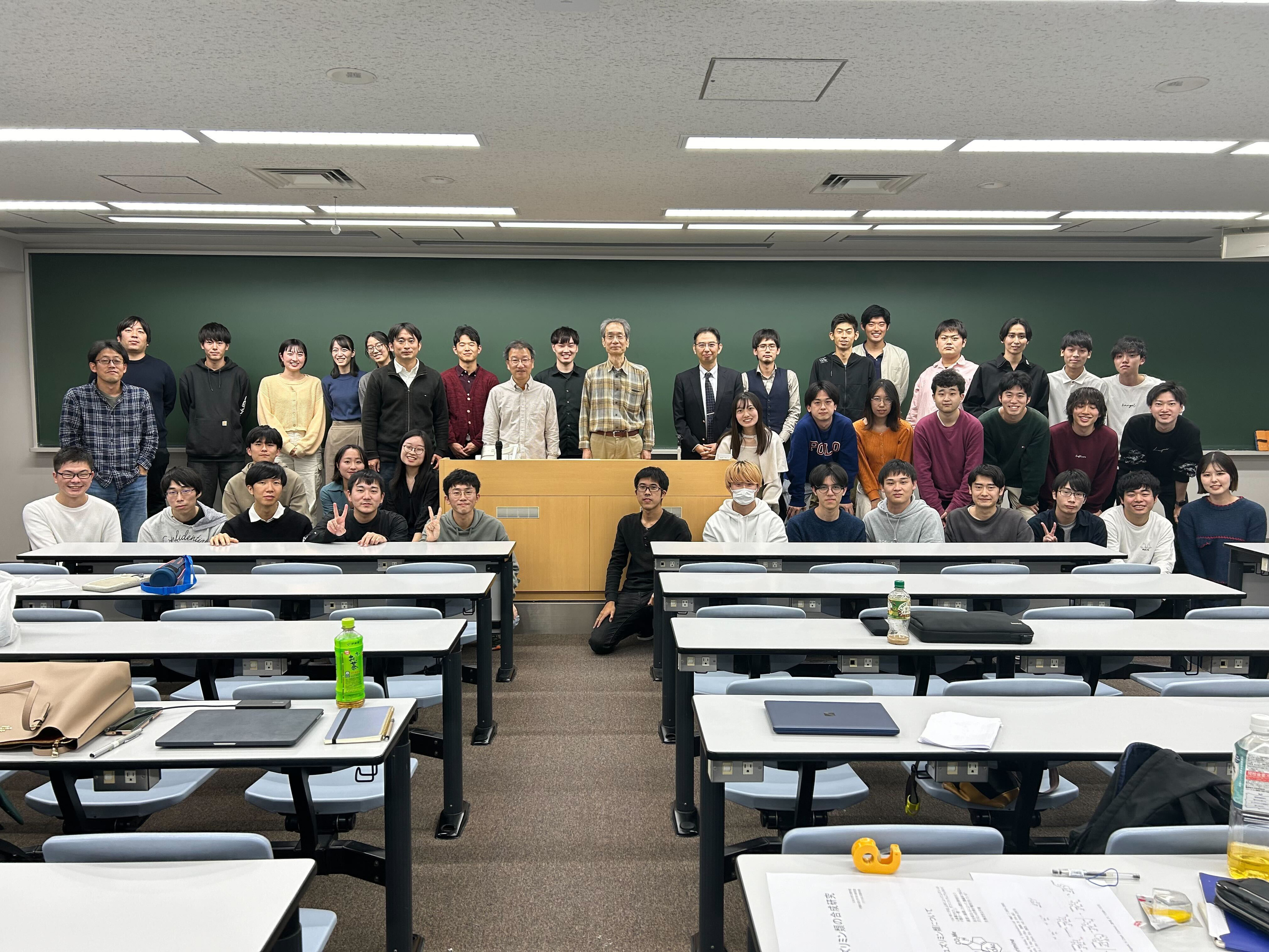 名古屋大学大学院生命農学研究科 西川俊夫先生にお越しいただき,講演会を行っていただきました.西川先生は私の静岡大学上村研の大先輩です.上村研OBの中では数少ない全合成をメインに研究を展開されており,同じく全合成で勝負している早川にとっては憧れの先輩でもあります.全合成を基盤として未解明な生物現象の解明や生合成経路を推定される研究は大変面白ったです(堤先生と一部の院生は学生実験のTAで聴講できず残念!).院生がたくさん質問してくれて,大いに盛り上がりました.