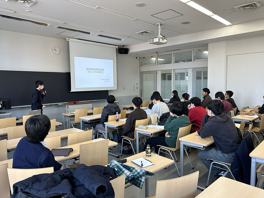 筑波大学の大好孝幸先生にお越しいただいて講演会を開催しました.大好先生は最近有機合成化学奨励賞や日本化学会年会の若い世代の特別講演に選出されるなど,天然物合成分野の若手のホープです.複雑な構造の天然物を巧みに合成されていて大変面白く,わかりやすく講演してくださいました.他研究室の方も数多く参加してくださり,大盛況でした.